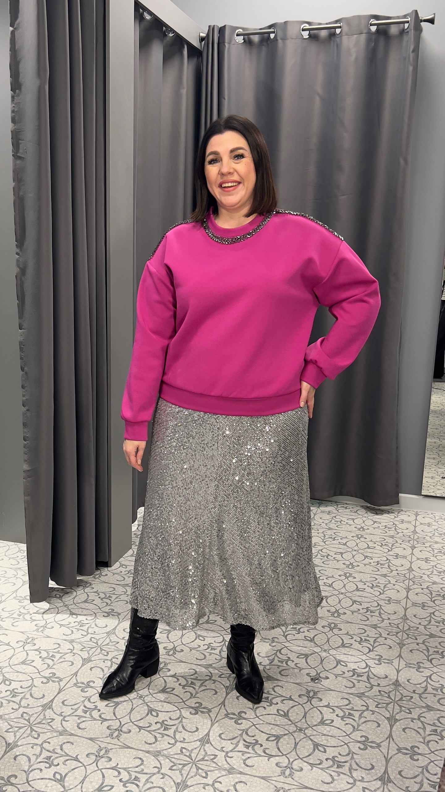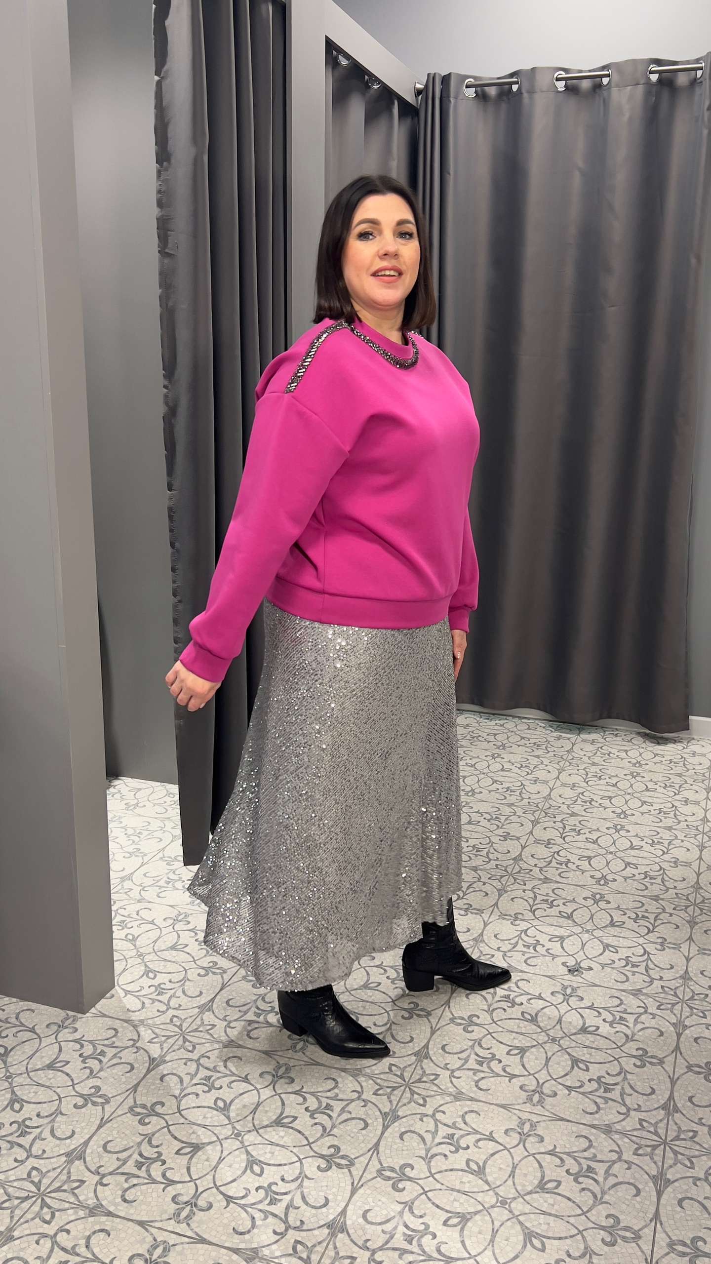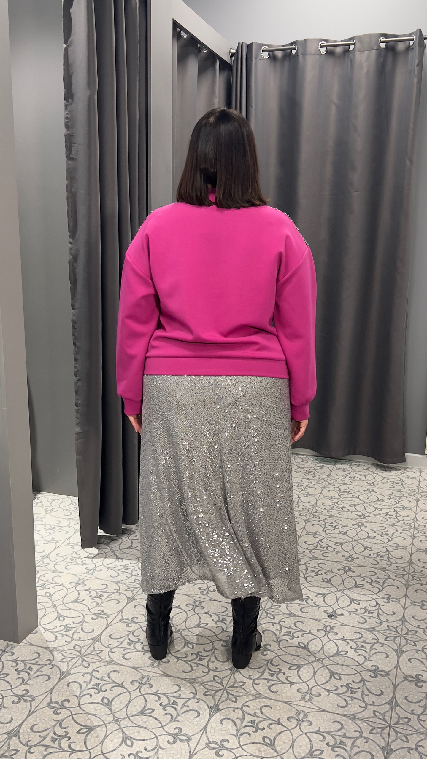 Яркий свитшот цвета фуксия с роскошной отделкой из крупных стразов по линии шеи и плеч. Модель свободного оверсайз кроя сочетает в себе повседневный комфорт и праздничный лоск. Сочный цвет привлекает внимание, а мерцающие стразы добавляют образу гламурности и блеска. Специальный крой обеспечивает удобство и модный силуэт, позволяя чувствовать себя уверенно на любом мероприятии.