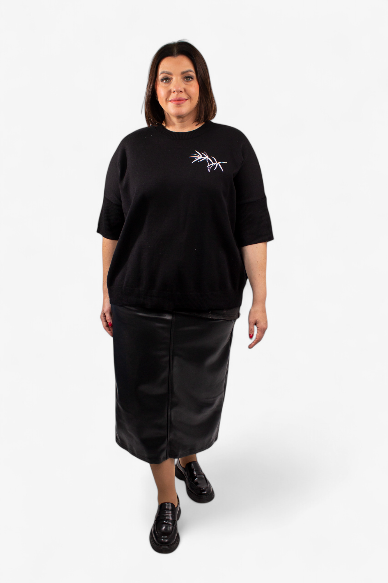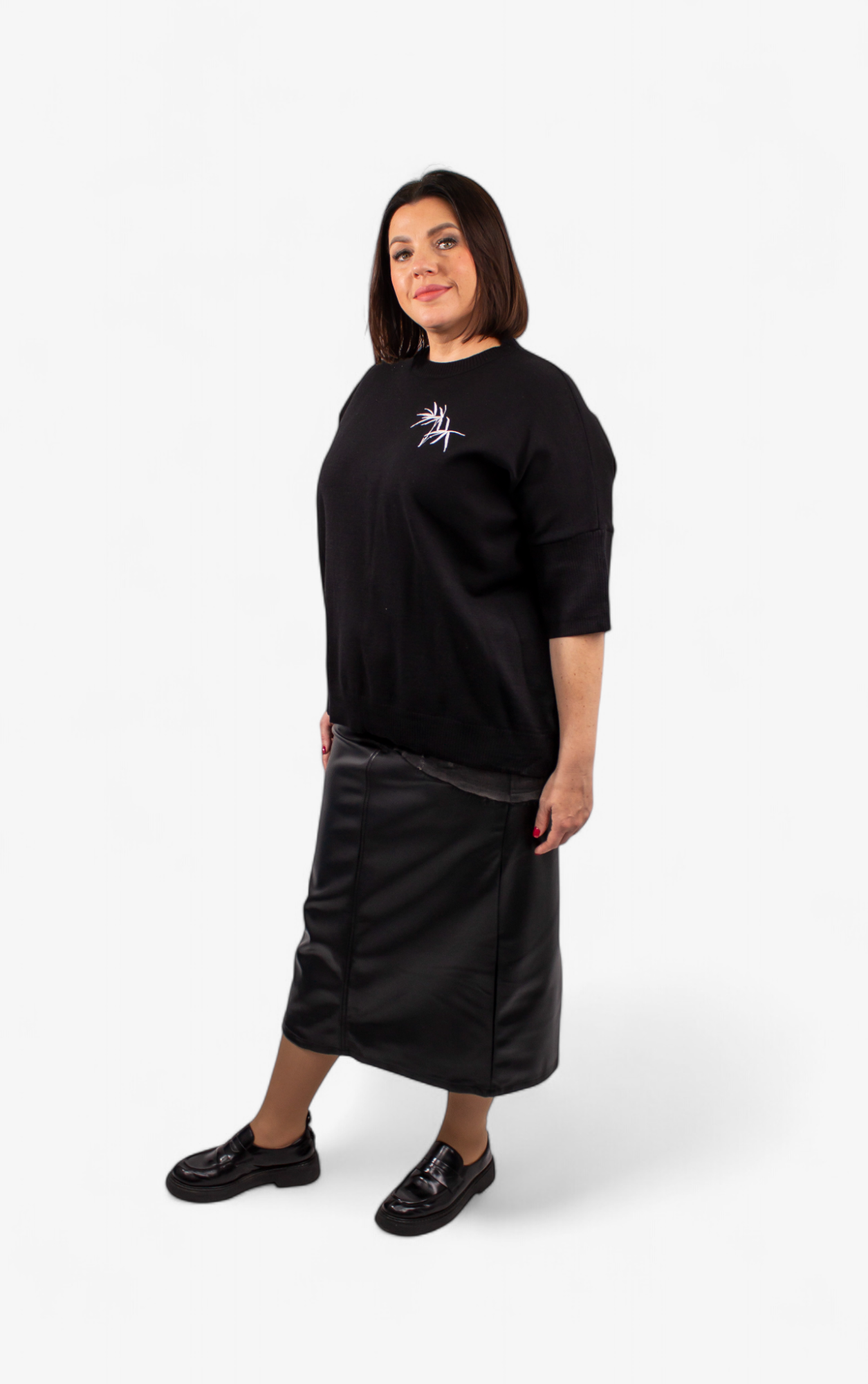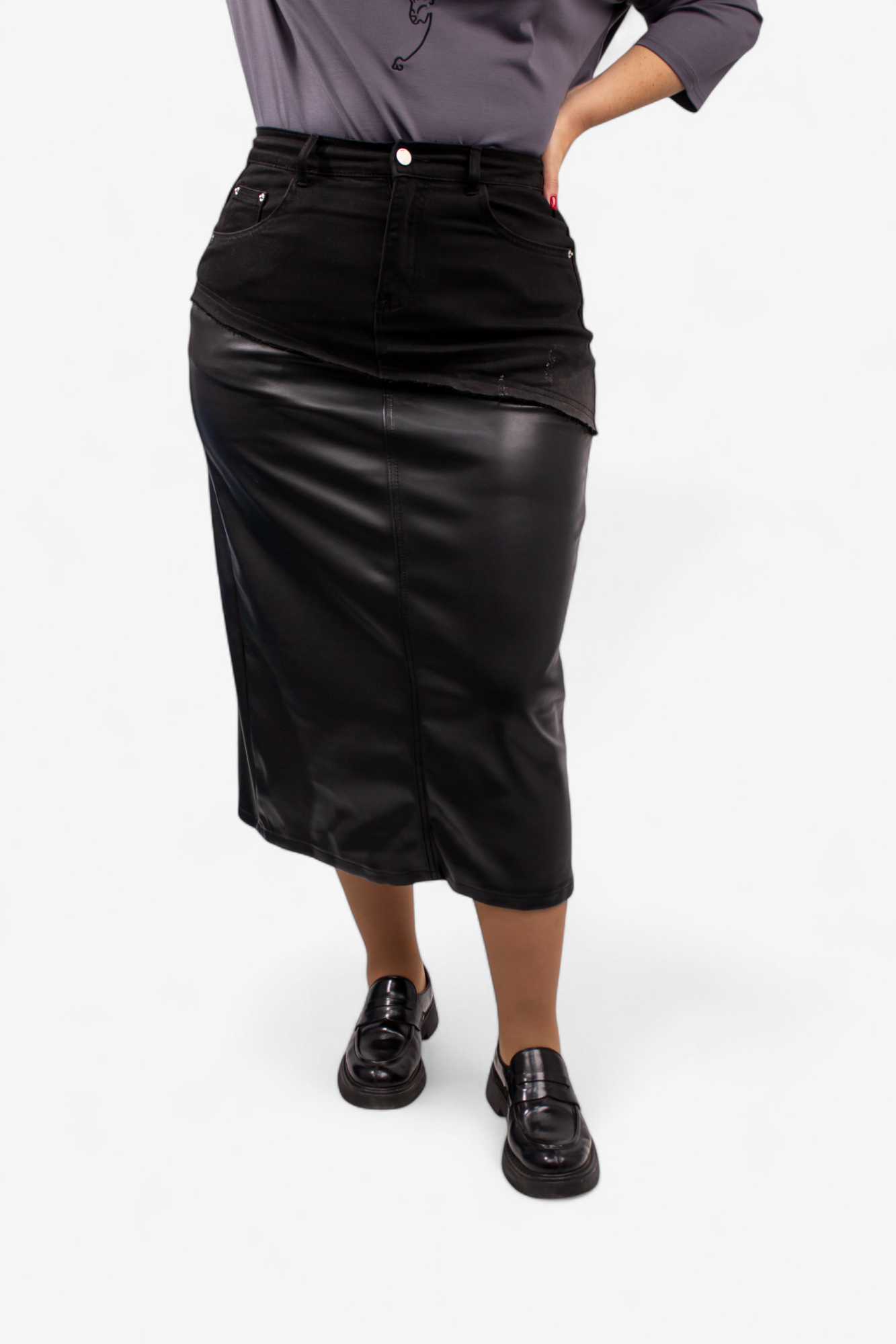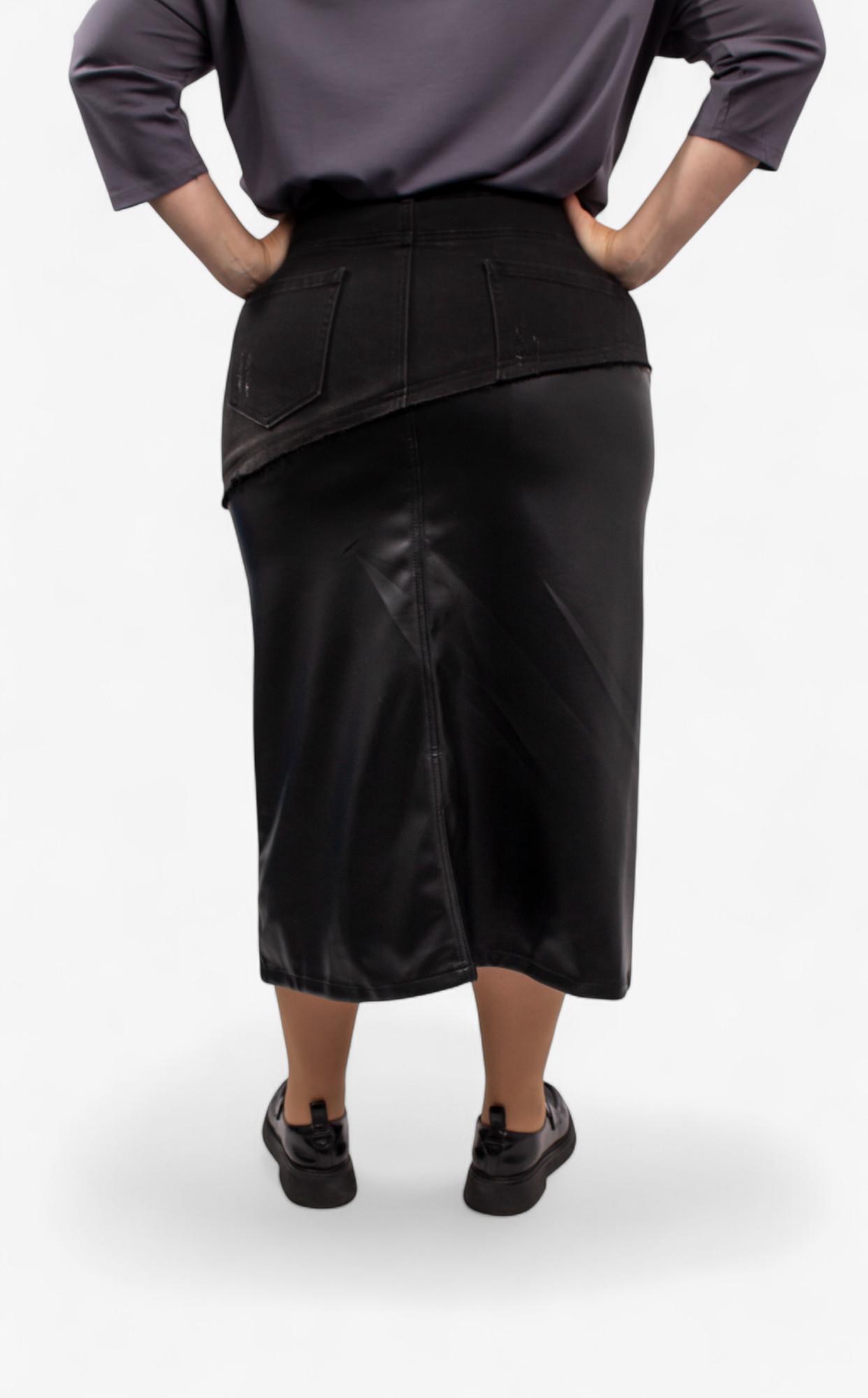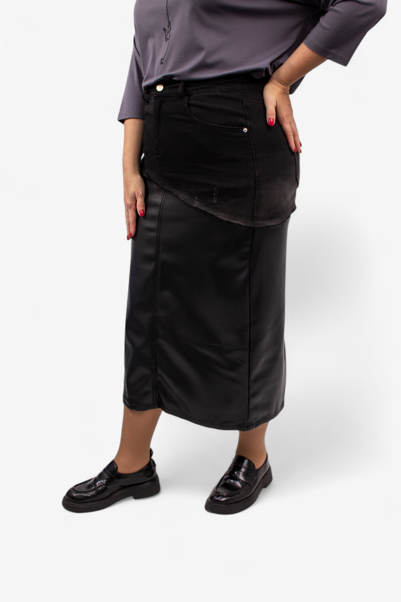 Наша юбка выполнена из высококачественного денима и экокожи, что придает ей современный и модный вид. Сочетание этих двух материалов создает уникальный стиль, который легко адаптируется под любой образ — от повседневного до вечернего.